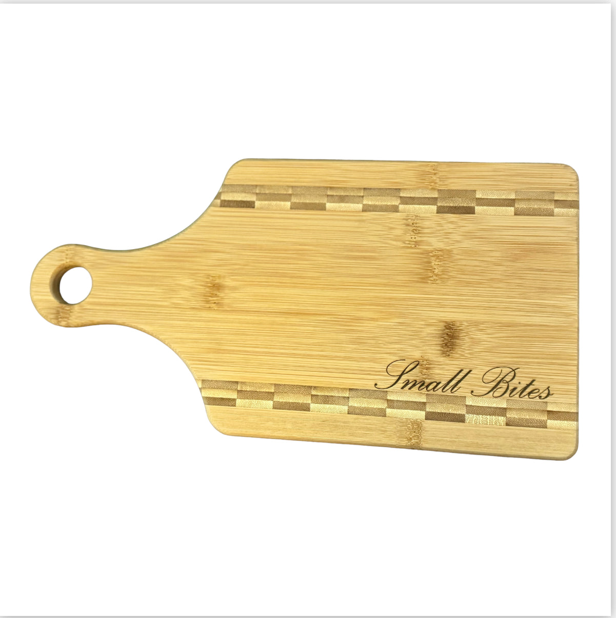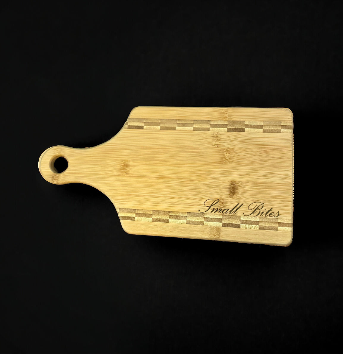 13.5”x7” Bamboo Butcher Block Inlay Charcuterie Board with Small Bites Laser Engraved Into it.
